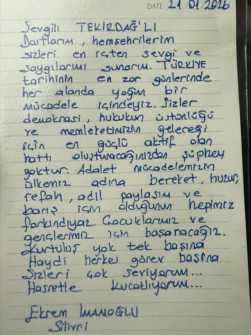 Sevgili TEKİRDAĞLI dostlarım. Hemşehrilerim, sizlere en içten sevgi ve saygılarımı sunarım. Türkiye tarihinin en zor günlerinde her alanda yoğun bir mücadele içindeyiz. Sizler demokrasi, hukukun üstünlüğü ve memleketimizin geleceği için en güçlü aktif olan hattı oluşturacağınızdan şüphem yoktur. Adalet mücadelemizin ülkemiz adına bereket, huzur, refah, adil paylaşım ve barış için olduğunun hepimiz farkındayız. Çocuklarımız ve gençlerimiz için başaracağız. Kurtuluş yok tek başına, haydi herkes görev başına.
