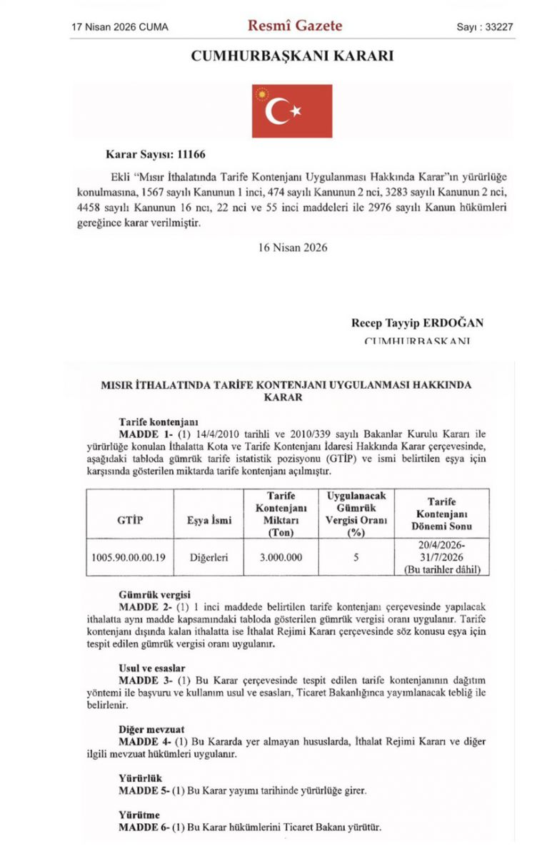 Resmî Gazete’de yayımlanan kararla Türkiye’nin mısır ithalatı için 20 Nisan – 31 Temmuz 2026 arasında %5 gümrük vergisiyle 3 milyon tonluk tarife kontenjanı açıldı.