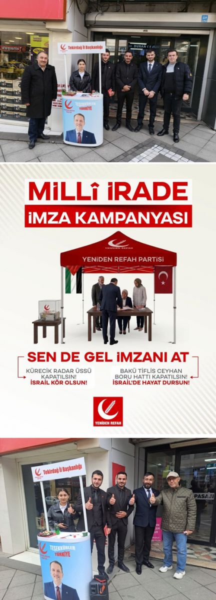 Genel Başkan Fatih Erbakan’ın “Milli İrade İmza Kampanyası” kapsamında Filistin’e destek vermek için ‘Sende Gel İmzanı At.’ ‘Kürecik Radar Üssü kapatılsın. İsrail kör olsun.’ Bakü Tiflis boru hattı kapatılsın. İsrail’de hayat dursun.’ Şeklindeki görsel paylaşımını kendi sosyal medya hesaplarından da paylaşan İl Başkanı Tuncay Çakır; düzenlenmesi planlanan imza kampanyasına “Filistin için konuş. Adalet için durma. Vicdanın için imzanı at!” şeklinde cevap verdi.